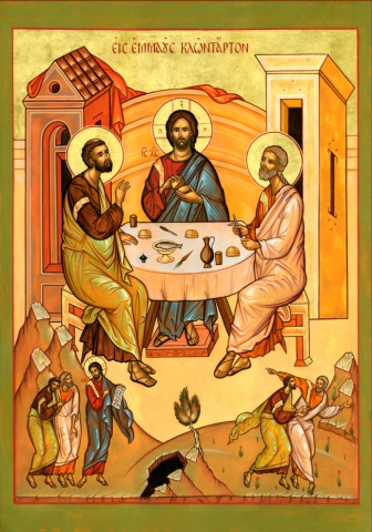 Ainsi, c’est seulement après la Résurrection que commence la véritable multiplication des pains, celle qui dure (l’imparfait) jusqu’à la fin des temps. Jésus se fait le convive des hommes, il continue à leur donner le Pain de Vie, et dans ce contact avec lui, la foi le reconnaît. L’insistance au début du récit sur « le même jour » (v. 13) souligne la condensation liturgique du temps dans le dimanche chrétien.